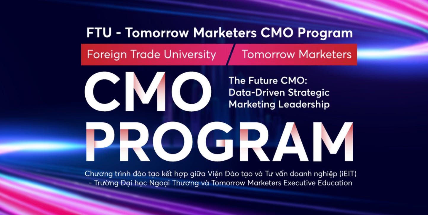 Nếu bạn muốn học cách tư duy hoạch định chiến lược tăng trưởng bền vững, tìm hiểu ngay CMO Program - Data-Driven Strategic Marketing: Trở thành CMO thế hệ mới với chuyên môn về Brand, Strategy, Data & AI với CMO Program của Trường ĐH Ngoại Thương - Viện Đào tạo và Tư vấn doanh nghiệp hợp tác cùng Tomorrow Marketers Executive Education.