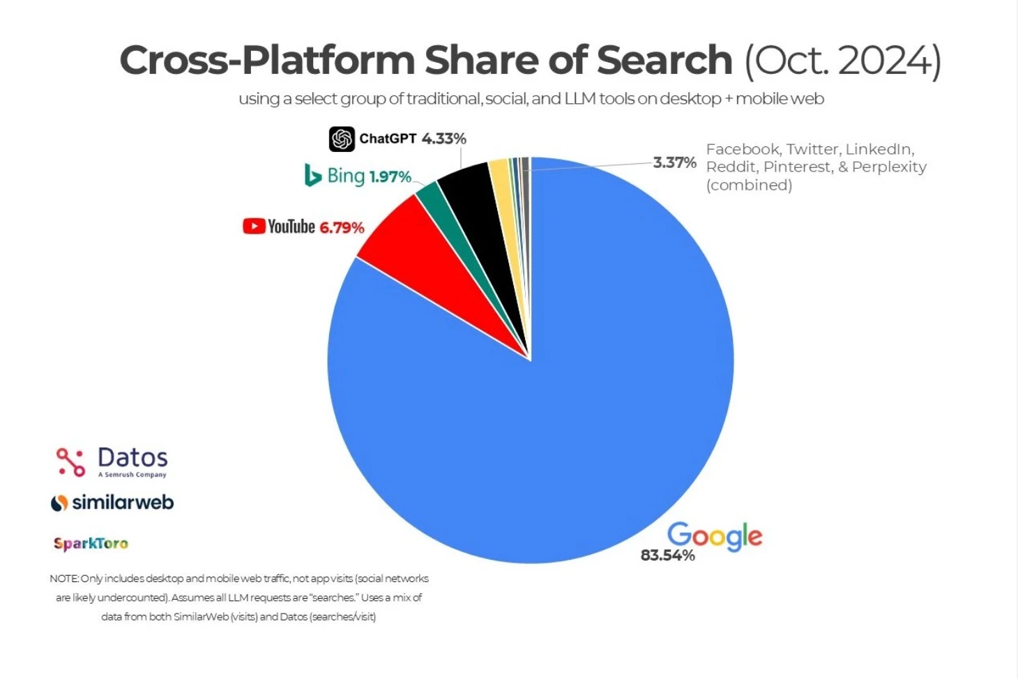 Thị phần ngành search engine: Google vẫn tiếp tục dẫn đầu với khoảng 83.54% thị phần toàn cầu. Tiếp đến là Youtube chiếm 6.79% và ChatGPT với 4.33%.