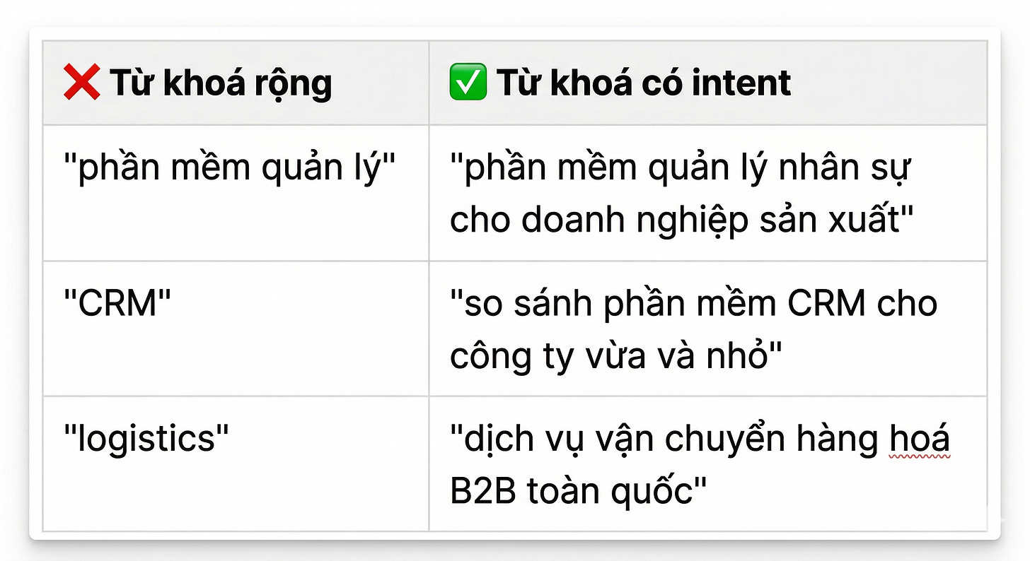 Nguyên tắc chọn từ khoá B2B: càng cụ thể càng tốt. Thay vì bid từ khoá rộng, hãy đi vào từ khoá có ý định rõ ràng:
