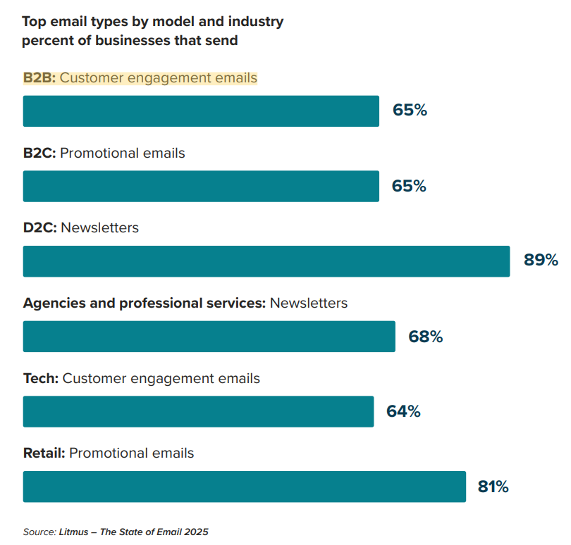 Theo Litmus, 65% doanh nghiệp B2B cho biết loại email được sử dụng nhiều nhất của họ là customer engagement email, nhằm nuôi dưỡng mối quan hệ, cung cấp giá trị và duy trì tương tác với khách hàng, thay vì chỉ đơn thuần là email quảng cáo sản phẩm.