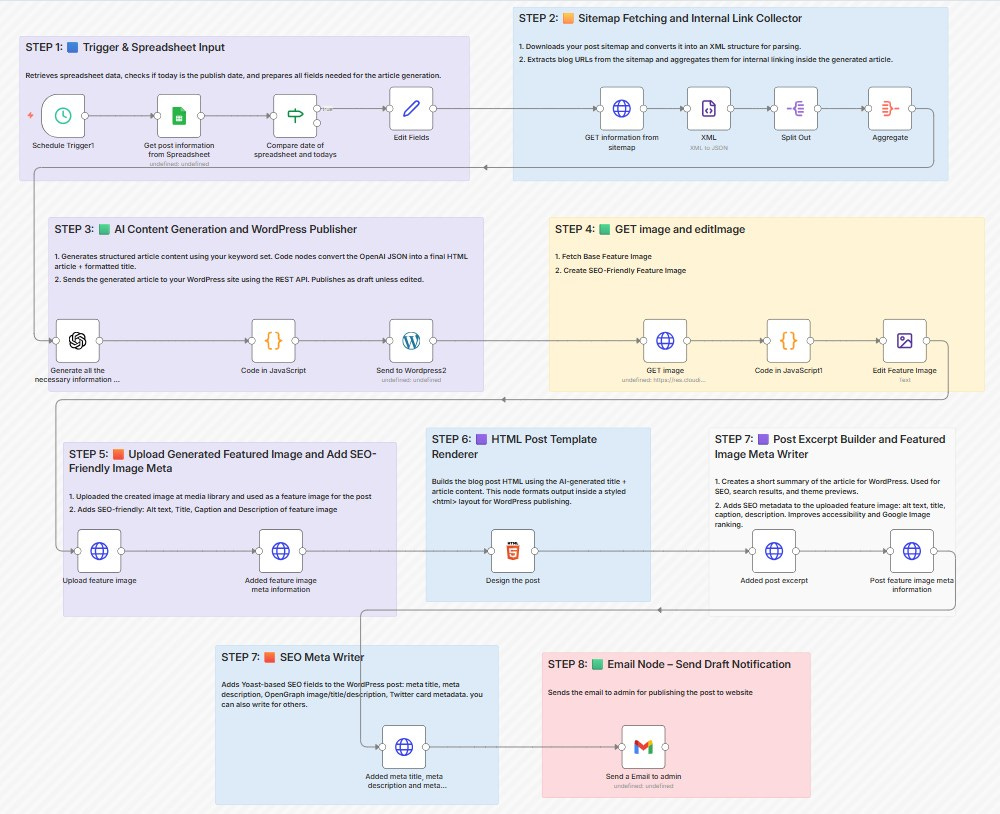 Ví dụ quy trình tự động hóa viết nội dung SEO bằng AI, hình ảnh, lên lịch đăng trên WordPress và thông báo email trên n8n