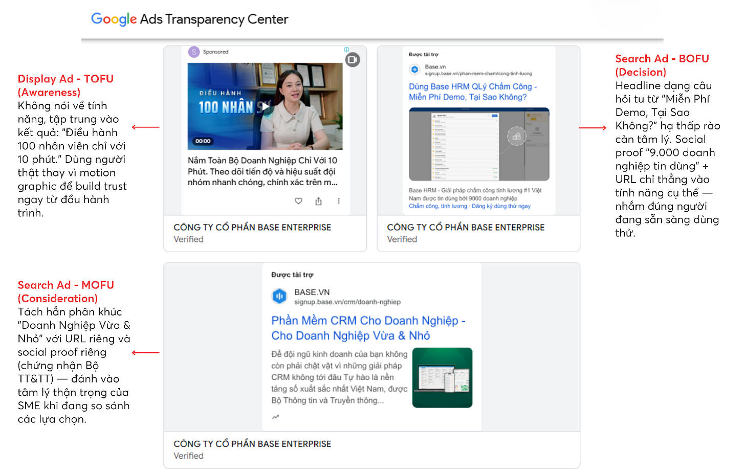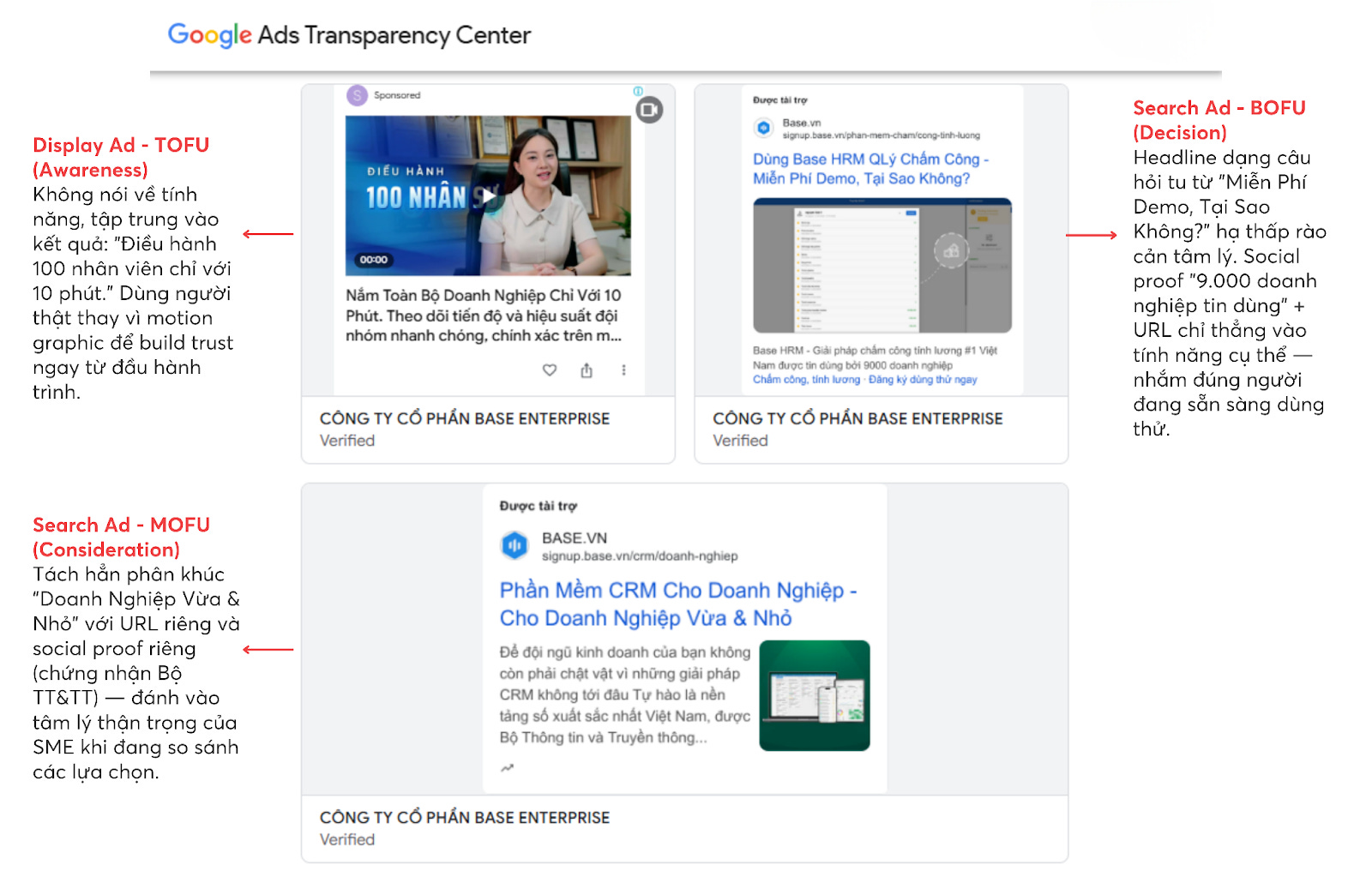 Base không chỉ chạy một loại ad duy nhất. Họ phủ cả 3 tầng funnel (video awareness → search consideration → search decision) và tách biệt rõ từng sản phẩm (HRM, CRM) với từng phân khúc khách hàng. Đây chính là cách Google Ads B2B hoạt động hiệu quả nhất: không phải một campaign “catch-all”, mà là hệ thống nhiều lớp nhắm đúng người đúng lúc đúng nhu cầu.