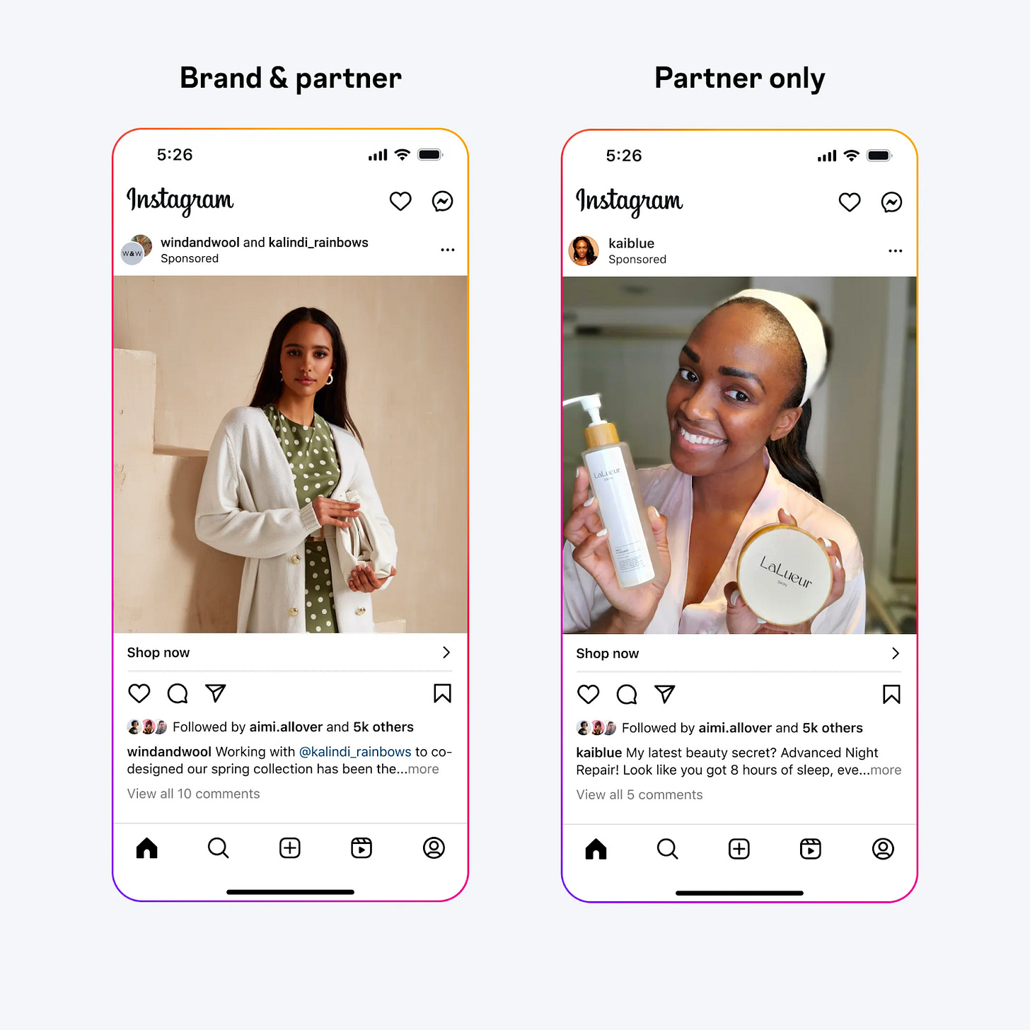 Trước kia, các bài đăng theo hình thức partnership ads sẽ hiển thị cả tên người sáng tạo nội dung và tên thương hiệu trong phần tiêu đề của quảng cáo. Giờ đây, tên thương hiệu không còn là yếu tố bắt buộc phải hiển thị phần tiêu đề quảng cáo của Facebook và Instagram.
