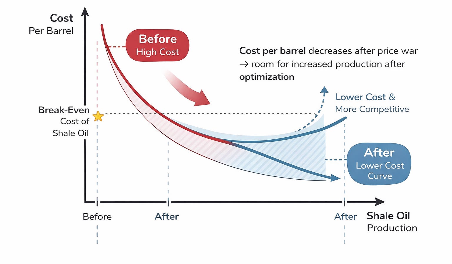 Nhưng chính chiến lược đó cũng kích hoạt một chuỗi phản ứng mà họ không kiểm soát được. Khi shale oil buộc phải tối ưu để tồn tại, họ không chỉ sống sót qua giai đoạn giá thấp, mà còn quay trở lại với một cấu trúc chi phí hiệu quả hơn.