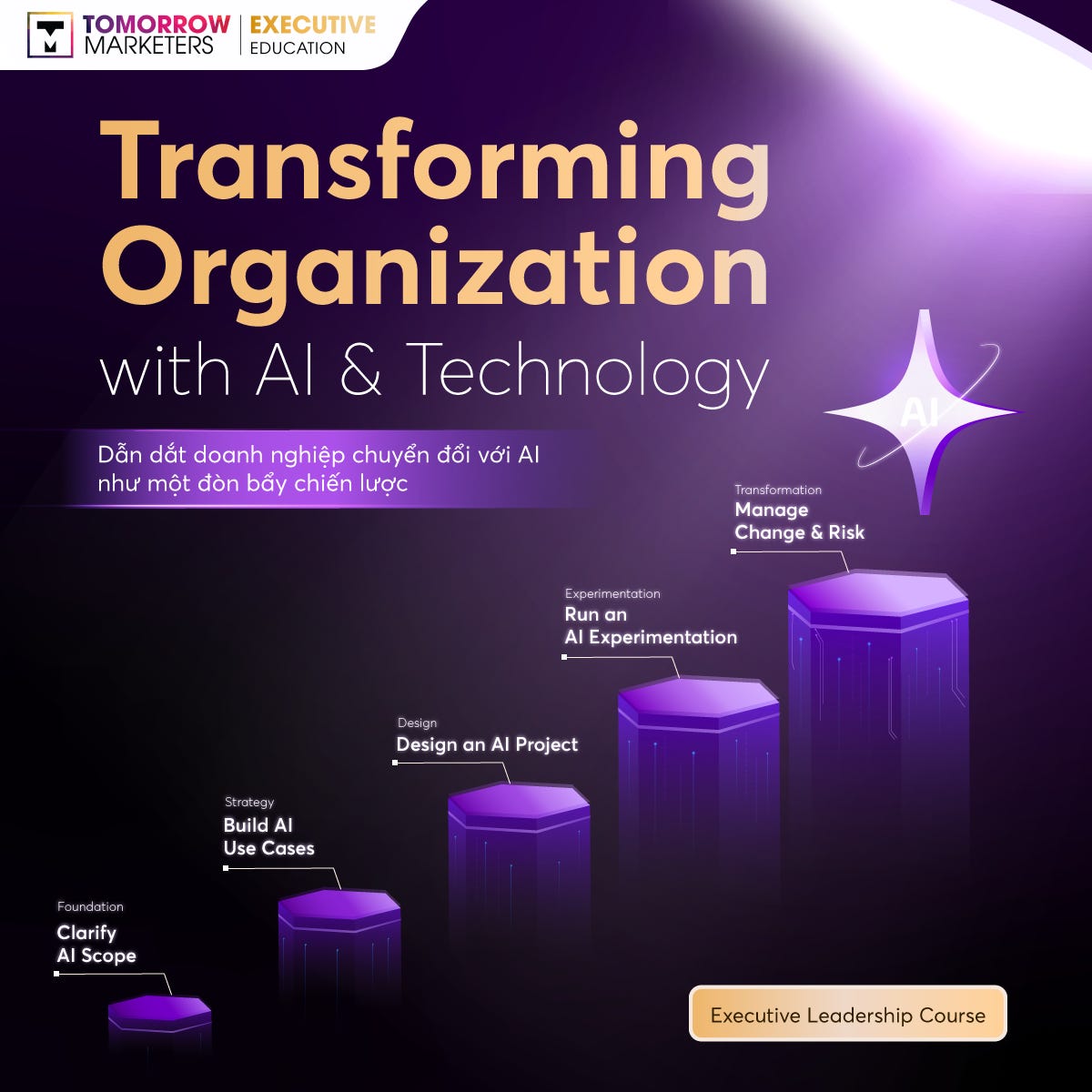 Tomorrow Marketers phát triển khóa học Transform Organization with AI & Technology - thiết kế riêng cho CEO, Founder, Business Owner, C-level và Head of Function đang trực tiếp chịu trách nhiệm về tăng trưởng, vận hành và chuyển đổi doanh nghiệp.