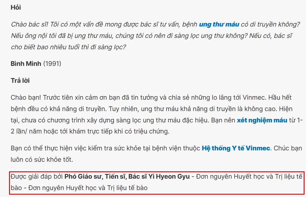 Ví dụ: Để tăng uy tín và thẩm quyền chuyên môn, các bài viết Hỏi - Đáp những vấn đề liên quan đến sức khỏe trên website Vinmec đều trích dẫn tên bác sĩ và chuyên môn y khoa vào cuối bài viết.