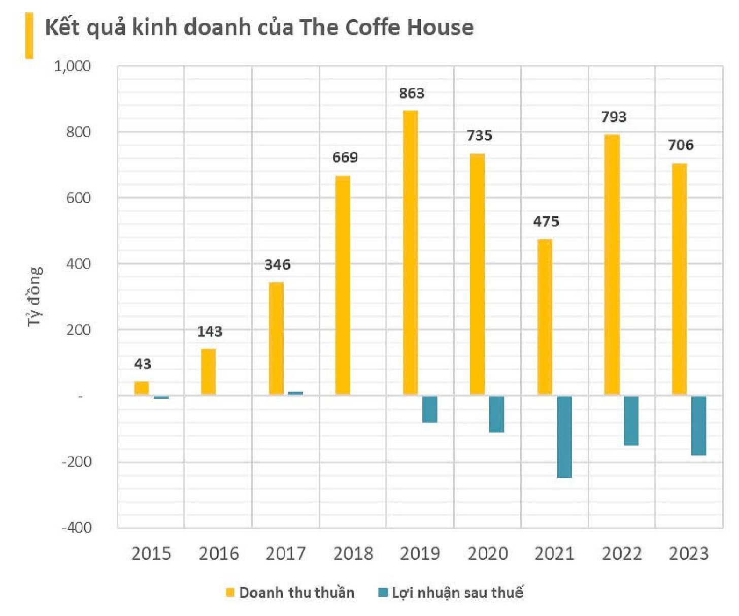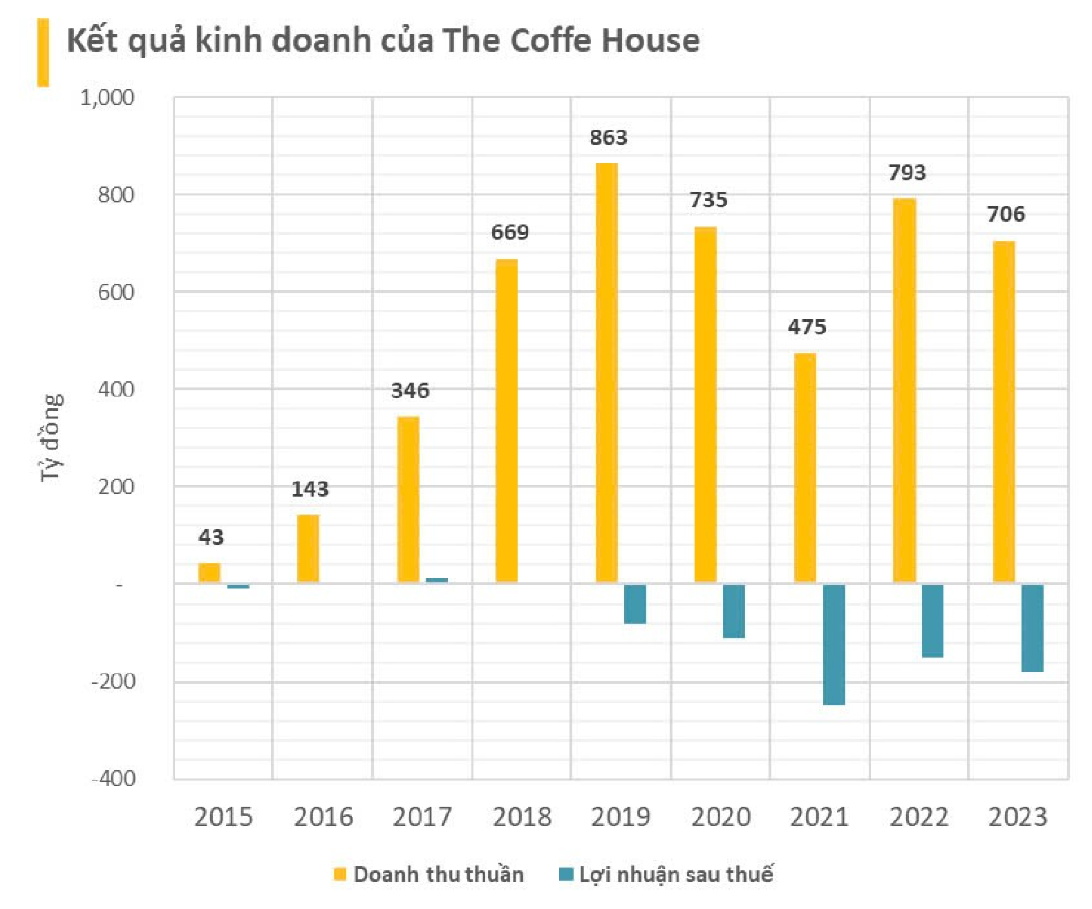 Không chỉ doanh thu suy giảm, The Coffee House còn liên tục ghi nhận thua lỗ trong nhiều năm, với mức lỗ sau thuế thường xuyên trên 100 tỷ đồng mỗi năm, khiến lỗ lũy kế đến cuối năm 2023 ở mức cao.